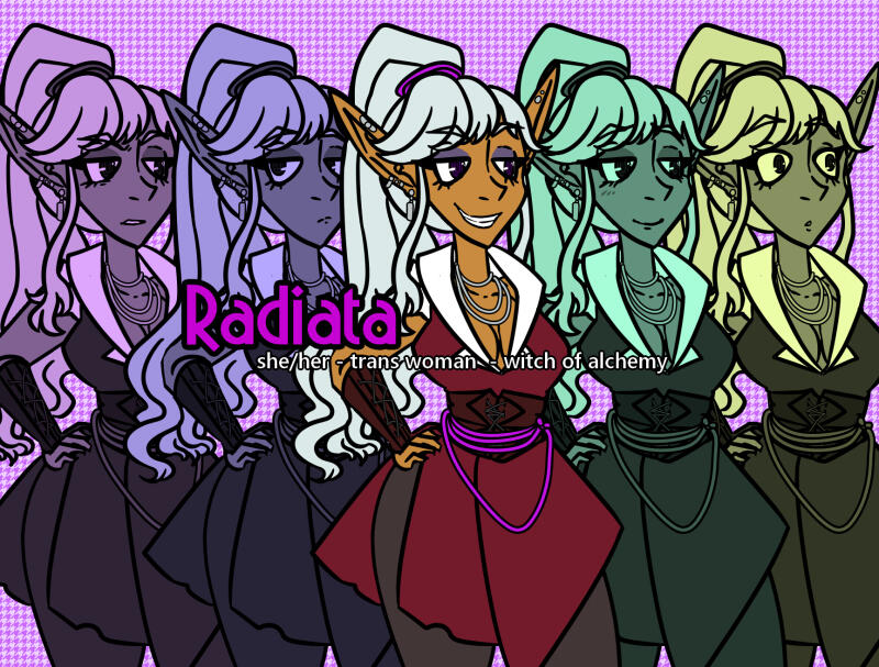 Radiata (pronounced rah-dee-AH-tah), she/her, trans woman. An elven witch that specializes in crafting and selling potions. Open-minded, carefree, a bit of a trickster, but loyal. Gets serious and technical about alchemical knowledge. Is friends-with-benefits with a goblin noble named Jule (pronounced JOOL with a firm J, similar to the word 'jewel'.) Radiata enables Jule to experiment with their body using one of her potions. Sexy times and gender feels happen.Her voice should be spunky, playful, and a little dry. I am open to any accent as long as it is authentic or well-practiced.
